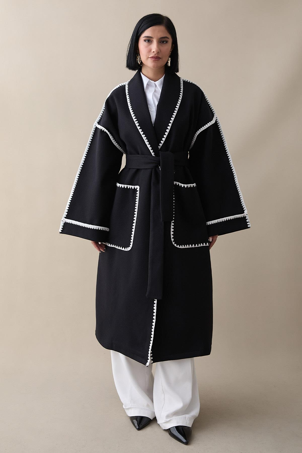 Çoban Dikiş Kuşaklı Siyah Kaşe Kap (MS00LM054-5)