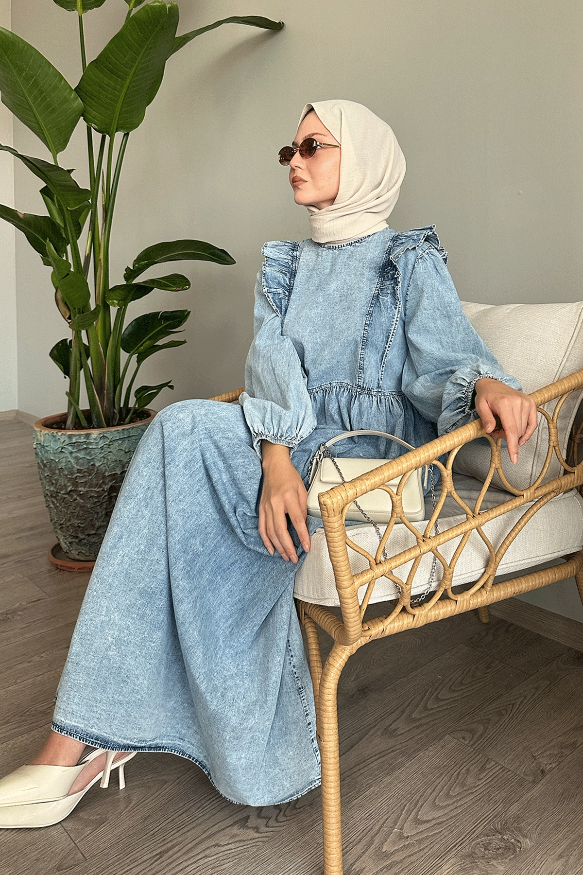 Fırfırlı Balon Kol Mavi Kot Elbise