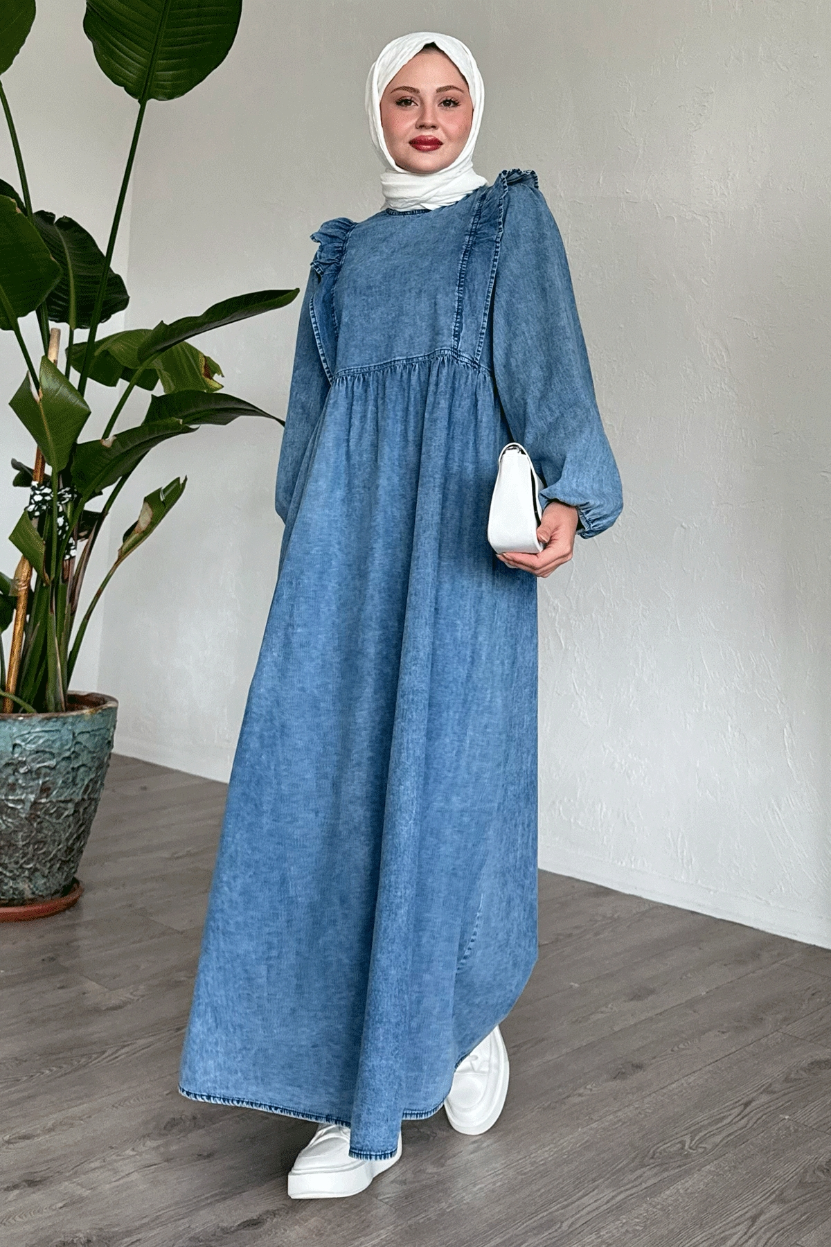 قماش الدنيم : هو خيوط متجددة طبيعياً وتكون مادتها الخام من القطن. إذا كانت هناك نسبة ليكرا ، فيجب سحبها عندما تكون مبللة. يوصى بغسل المنتجات بقلبها من الداخل للخارج لتجنب معدل التآكل على السطح الأمامي. يوصى باستخدام البخار للكي.