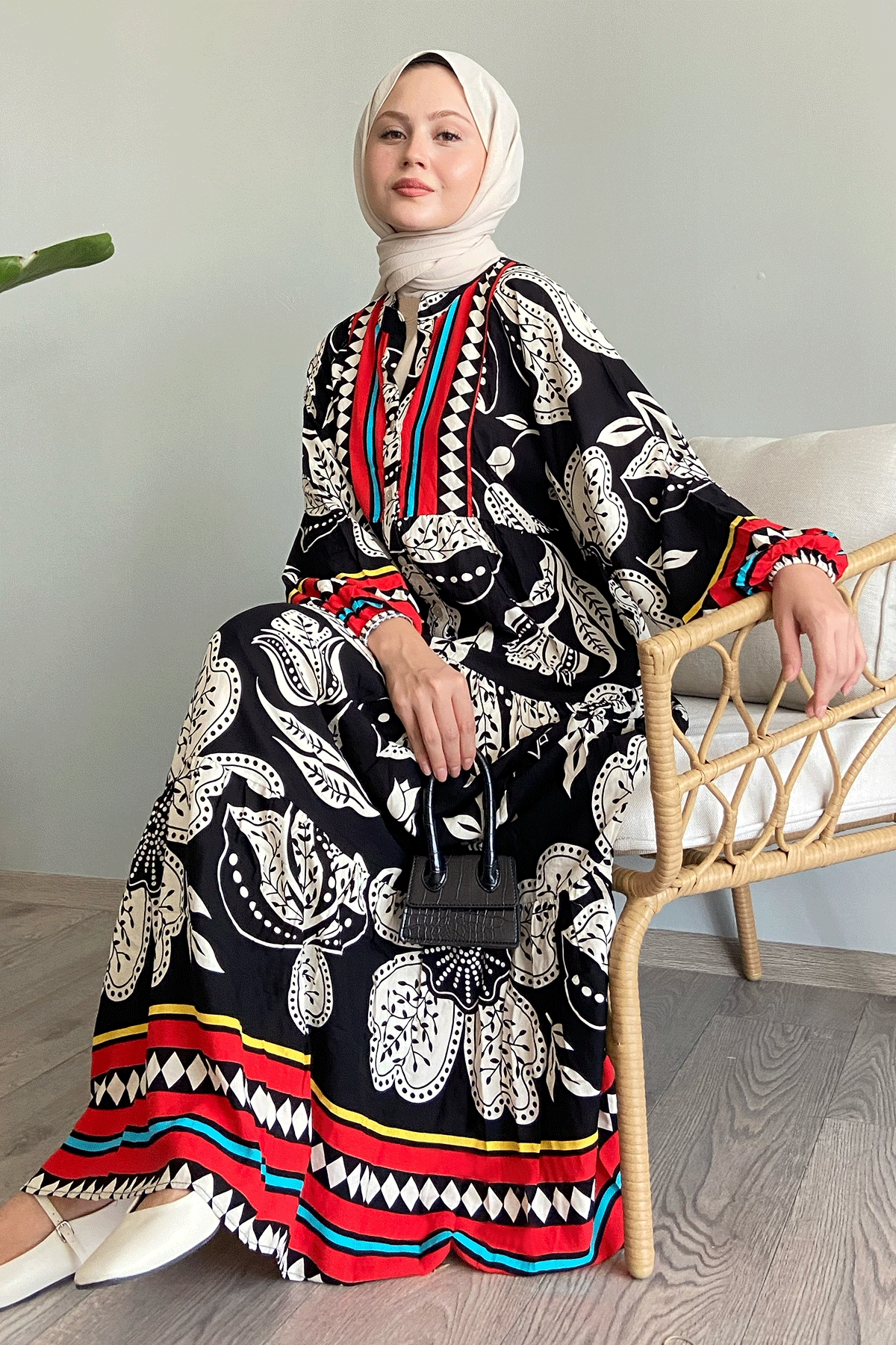 Renkli Karışık Salaş Siyah Viskon Elbise (MS00UM16-1)