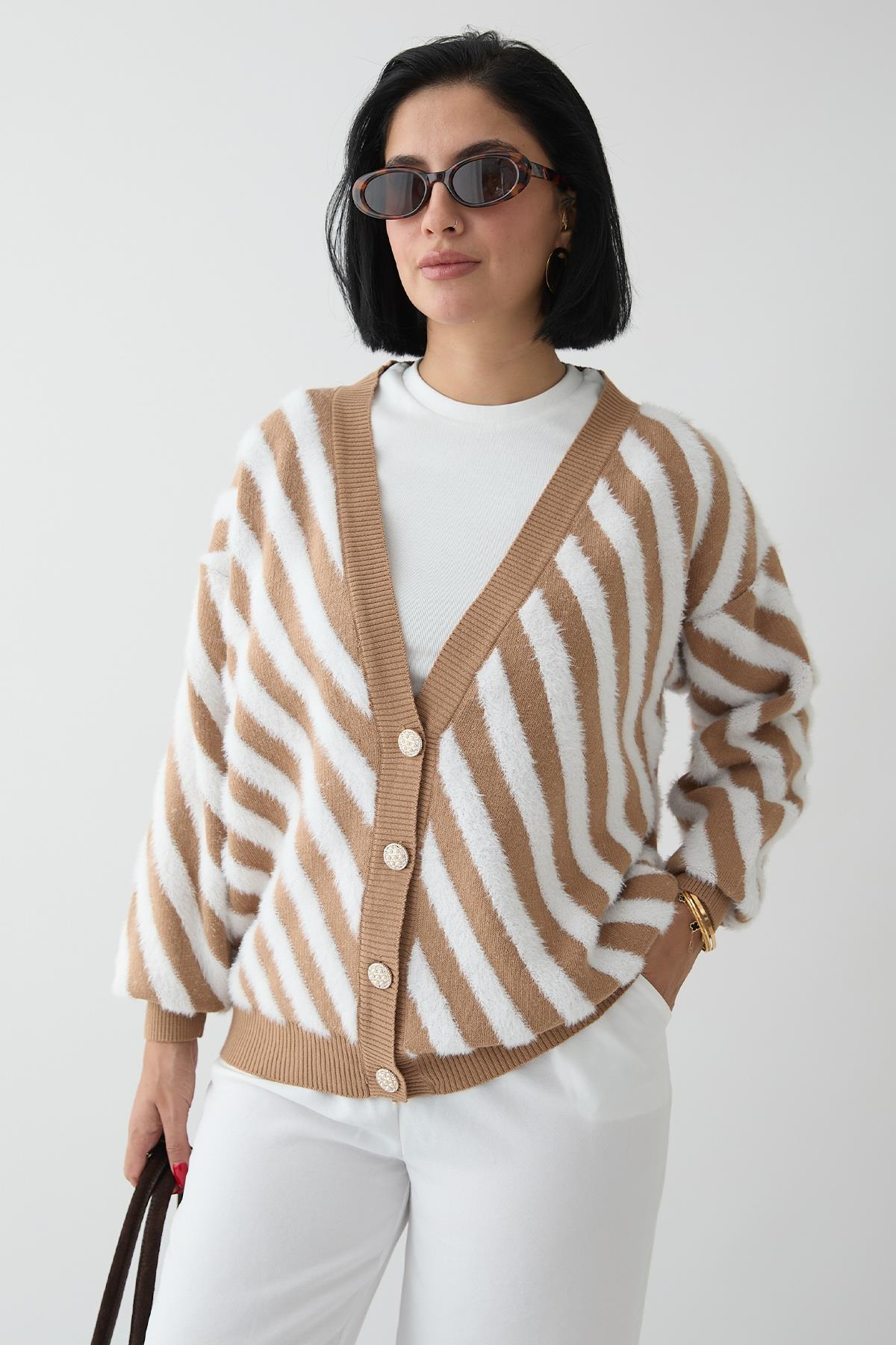 Tüy Şeritli Kısa Camel Triko Hırka (MS00SDN113-5)