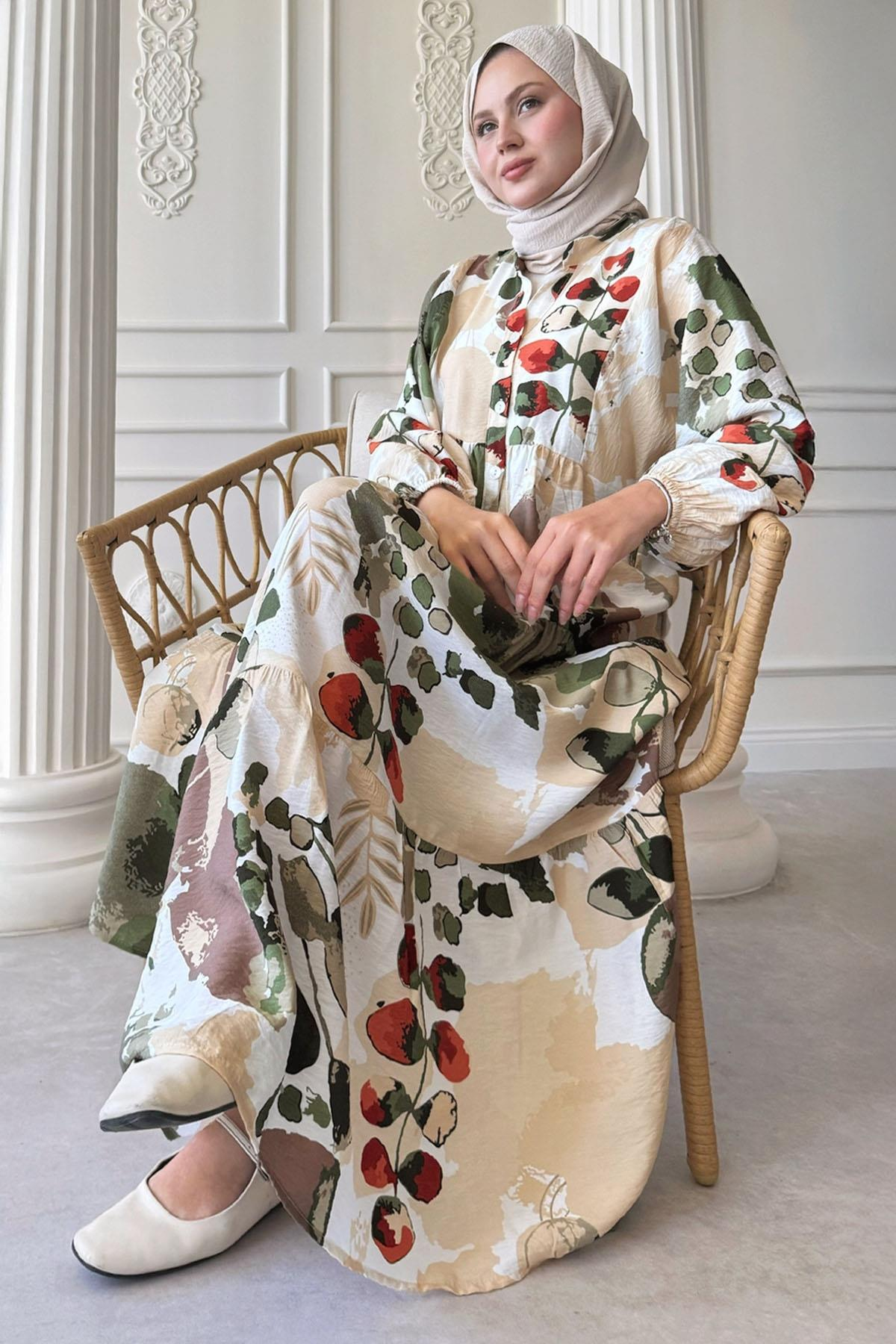 Buğulu Pastel Desen Yeşil Mango Elbise (MS00ALT2426-D-1)