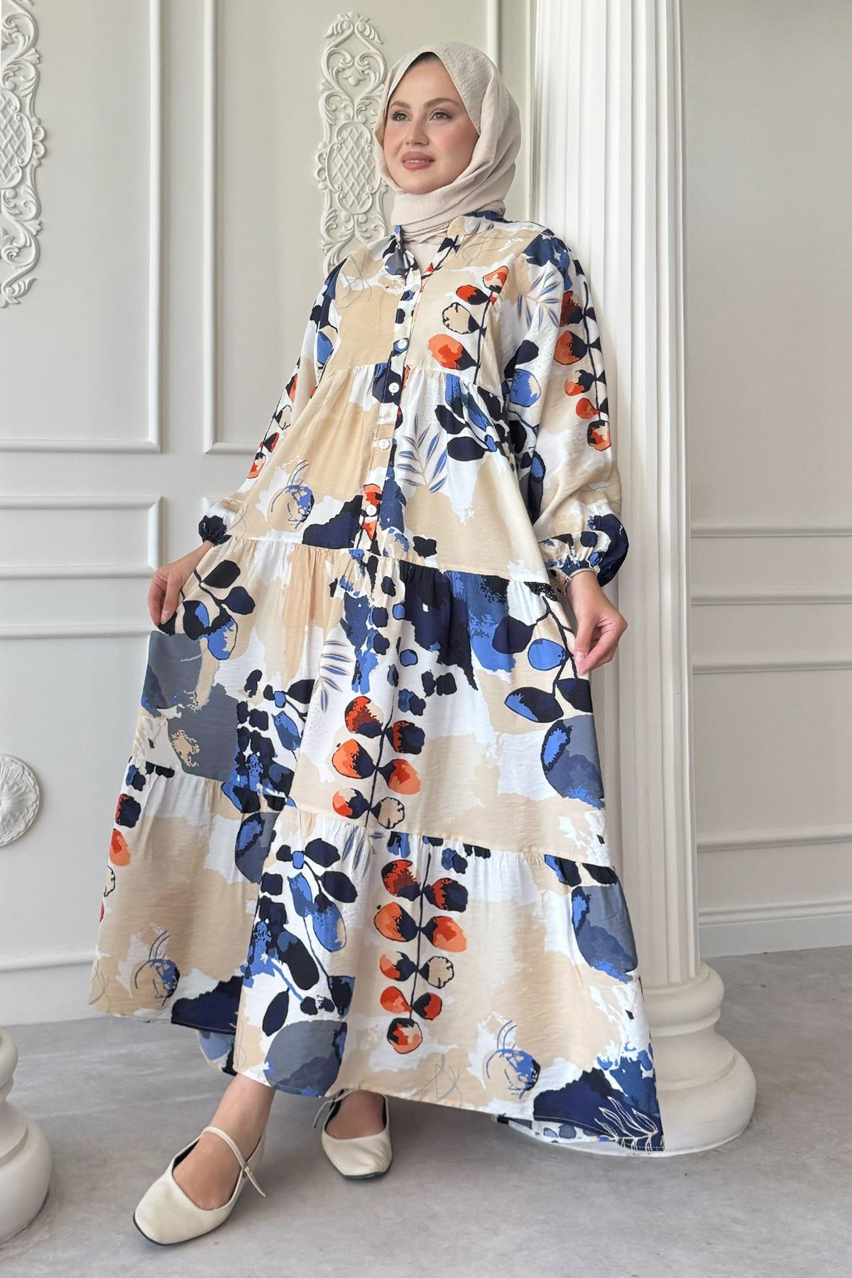 Buğulu Pastel Desenli Mavi Mango Elbise (MS00ALT2426-D-3)