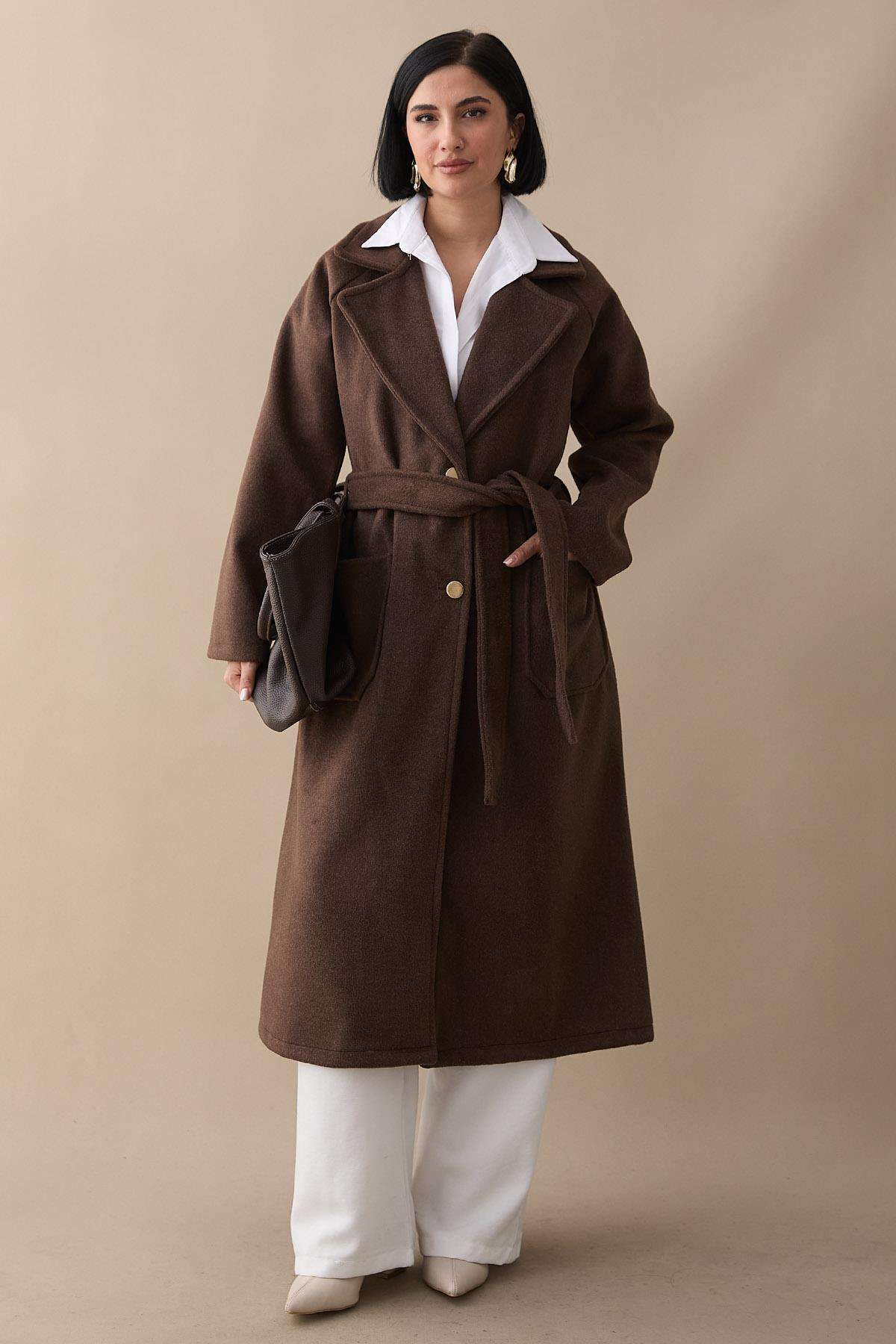 Çift Düğmeli Cepli Kuşaklı Acı Kahve Kaşe Kaban