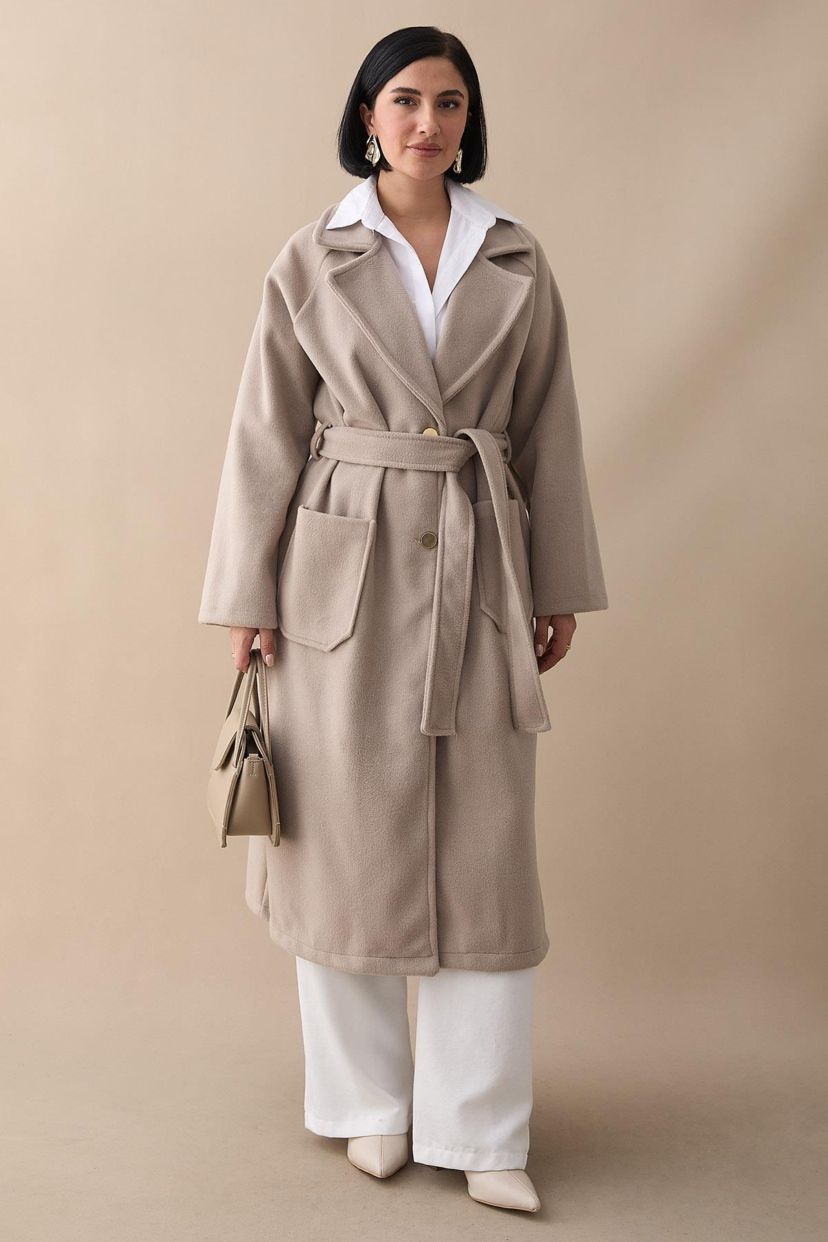 Çift Düğmeli Cepli Kuşaklı Kaşe Kaban