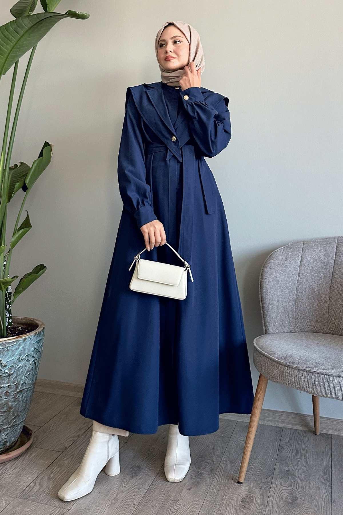 kuşaklıdır, çıkarılabilir yakası vardır.