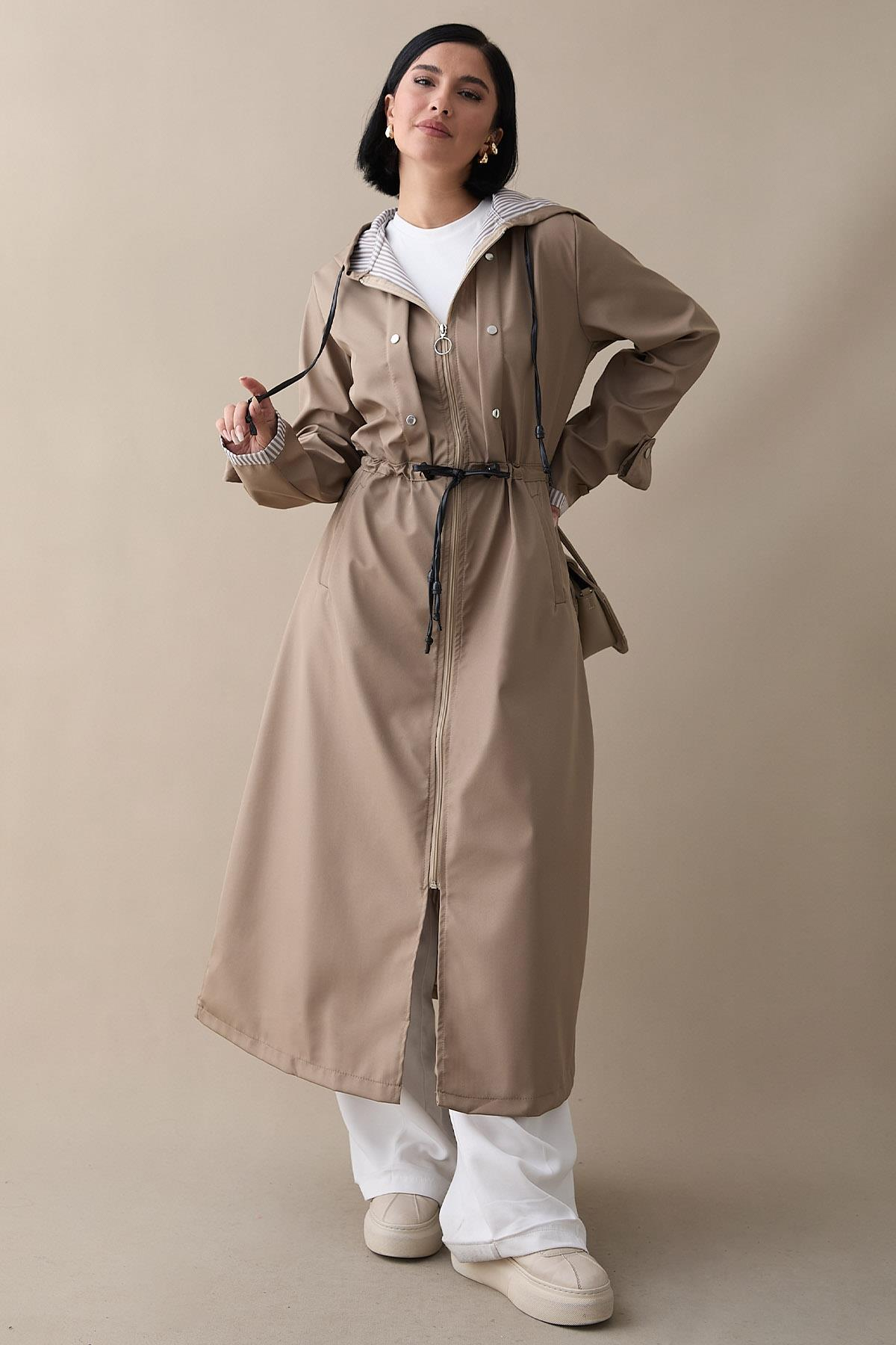 Çakımlı Çizgili Desen Uzun Bej Trençkot