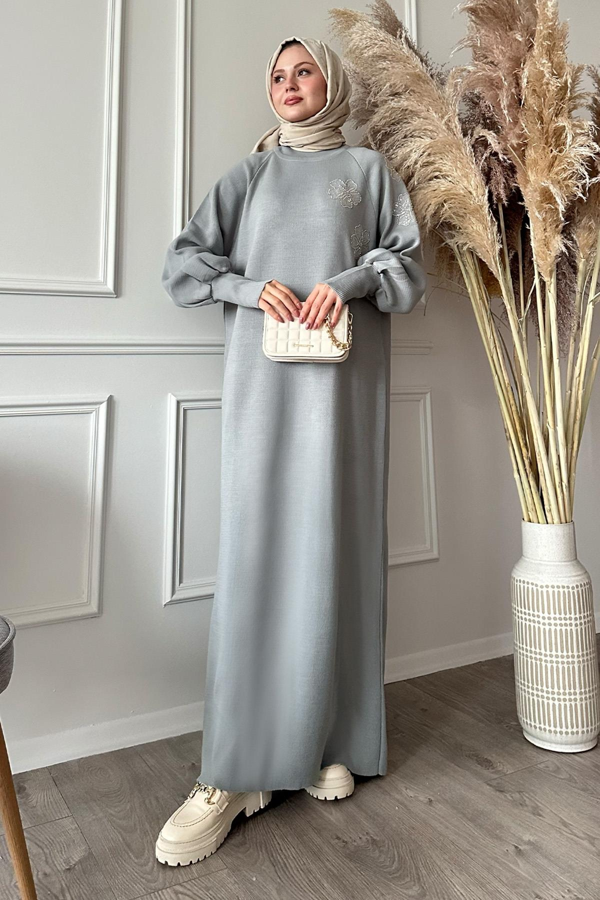 Floral Stone Balloon Sleeve Gray Knit Dress (MS00SDN328-1)
