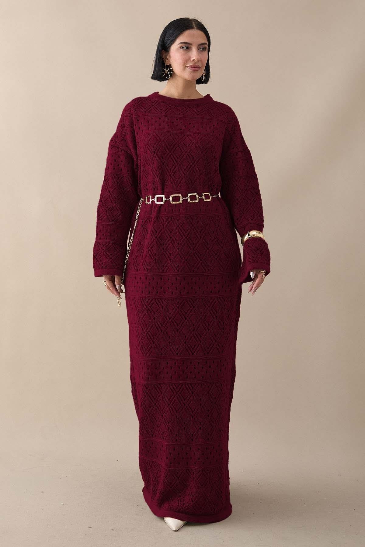 Desenli Ajurlu Bordo Triko Elbise (MS00RF0715-7)