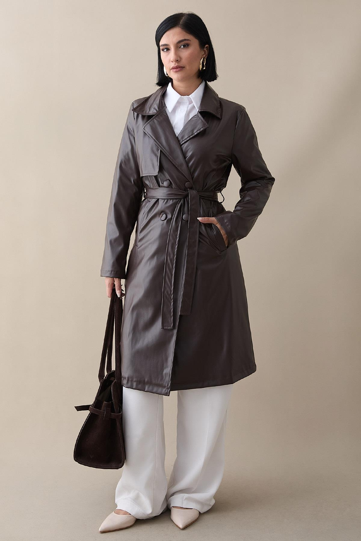 Kemerli Dar Kalıp Deri Trenç Acı Kahve