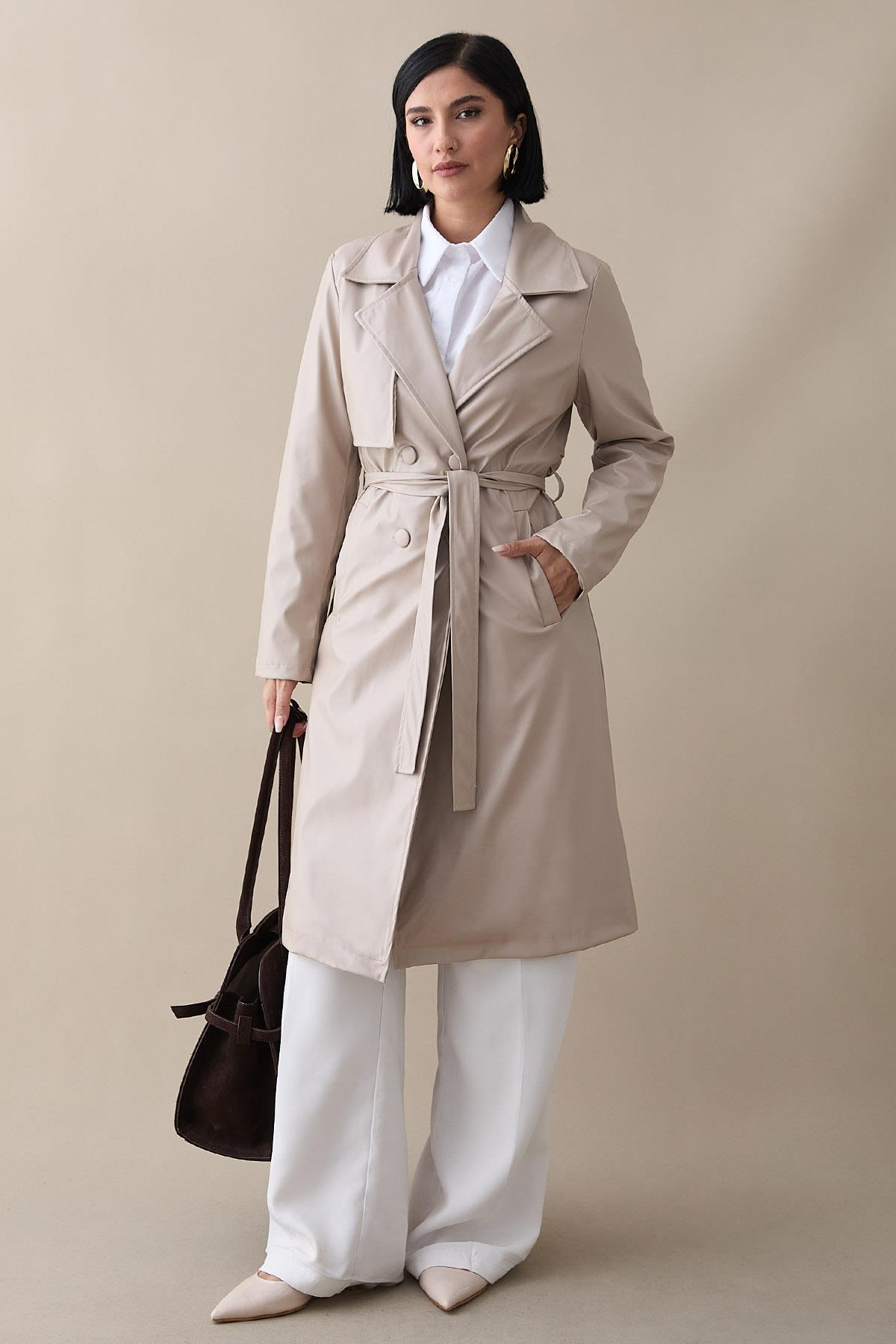 Kemerli Dar Kalıp Deri Trenç Bej