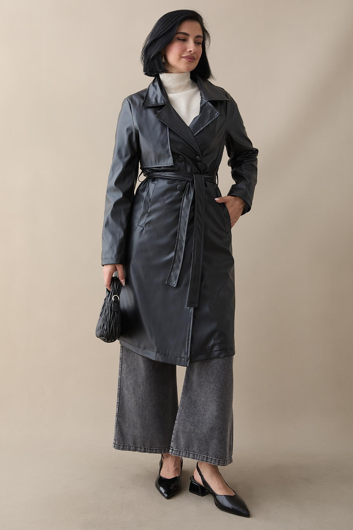 Kemerli Dar Kalıp Deri Trenç Siyah