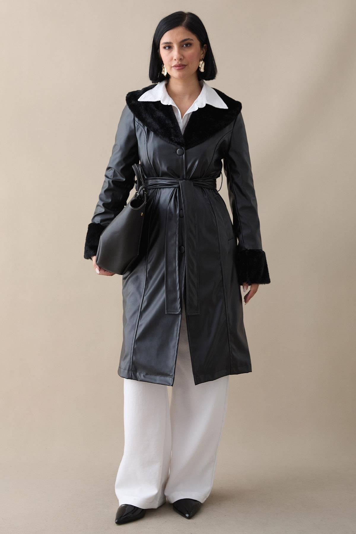 Kürk Detaylı Siyah Deri Trençkot (MS00AN6217-4)