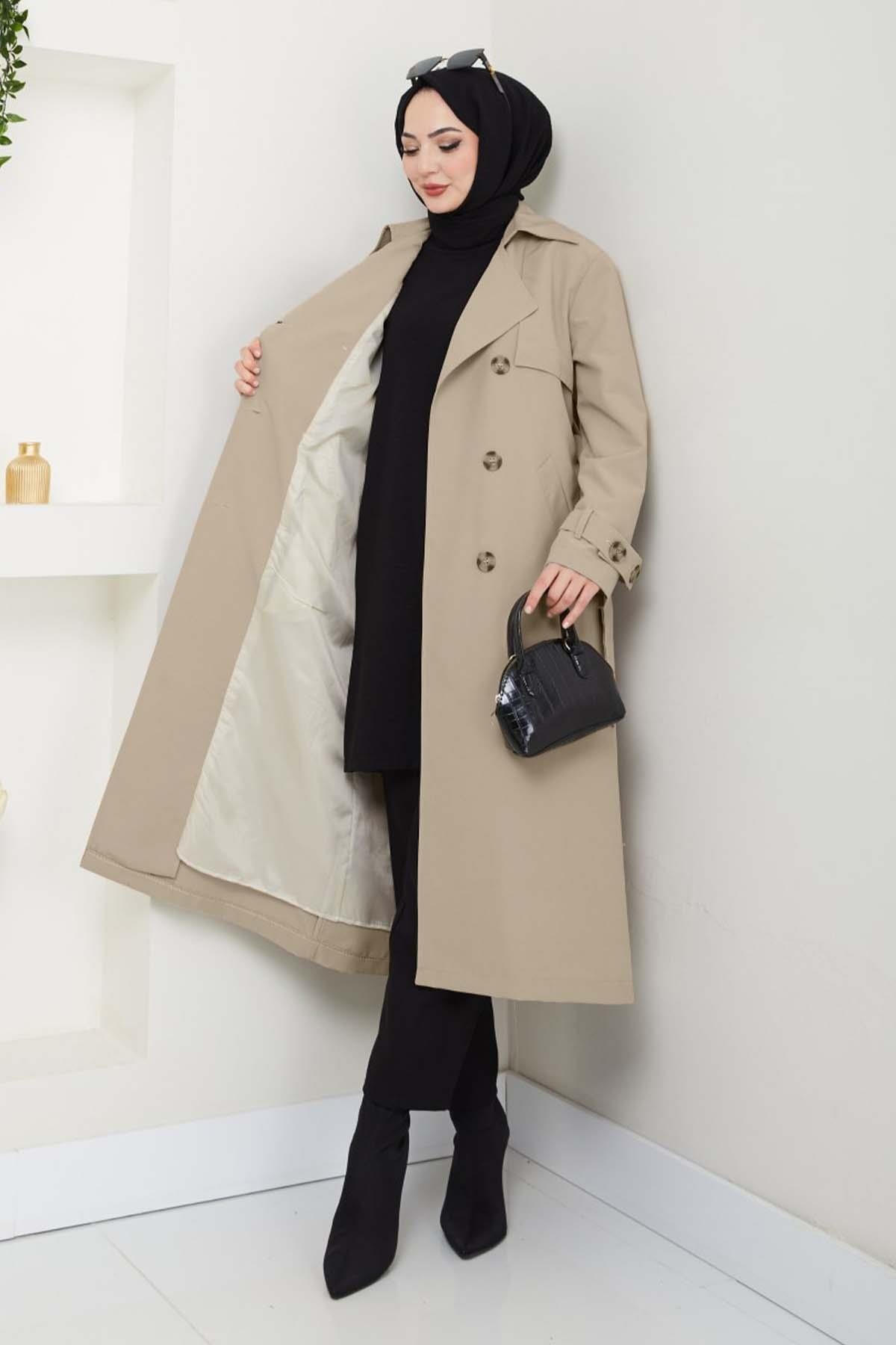 Taşlı Toka Detaylı Astarlı Açık Bej Trençkot (MS00GM039-8)