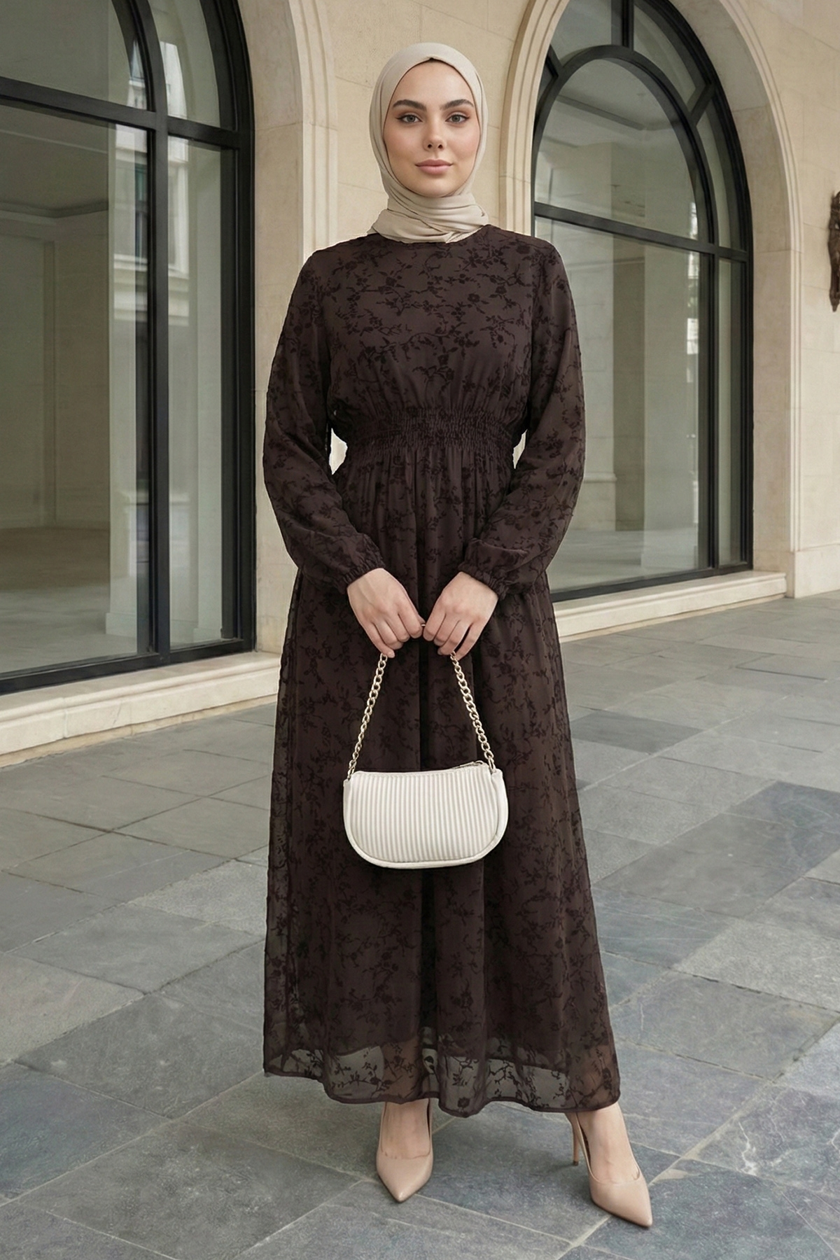 Flok Tül Acı Kahve Elbise