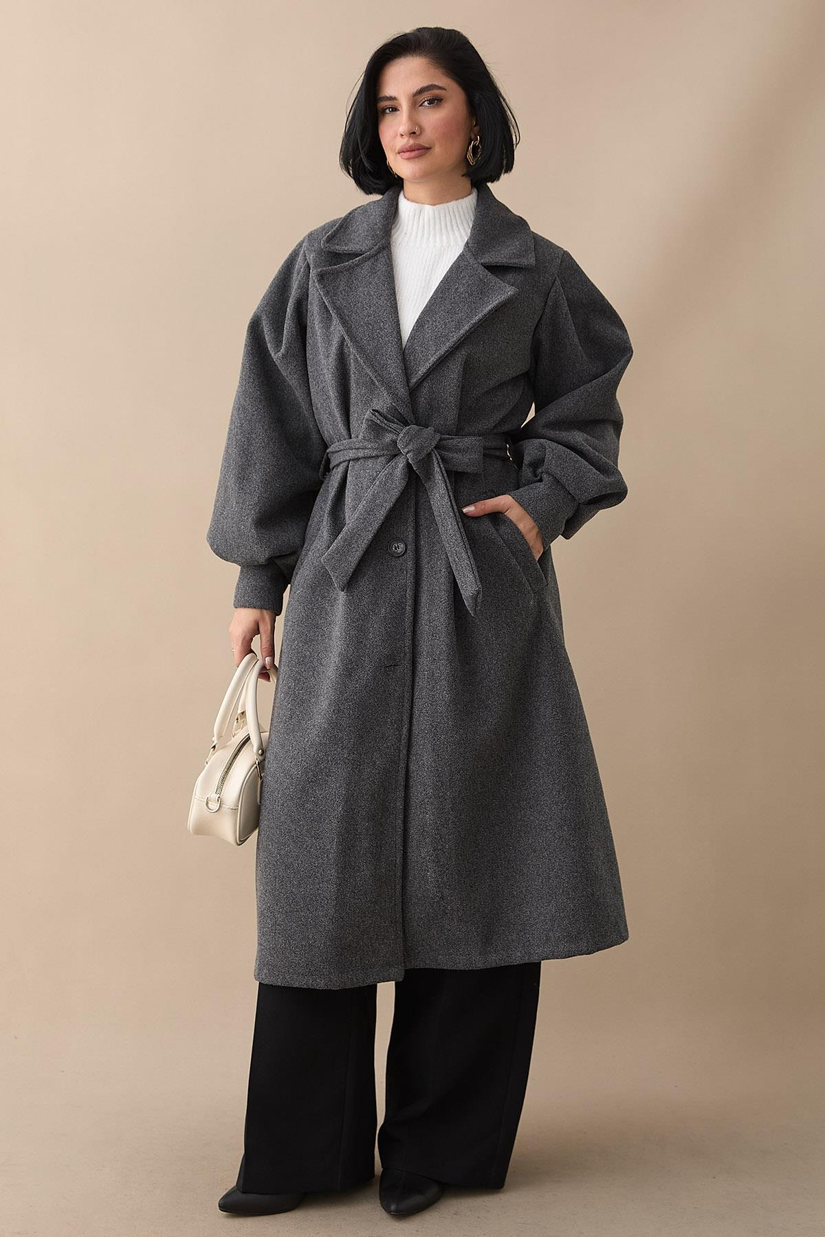 Kruvaze Balon Kol Kuşaklı Kaşe Kaban