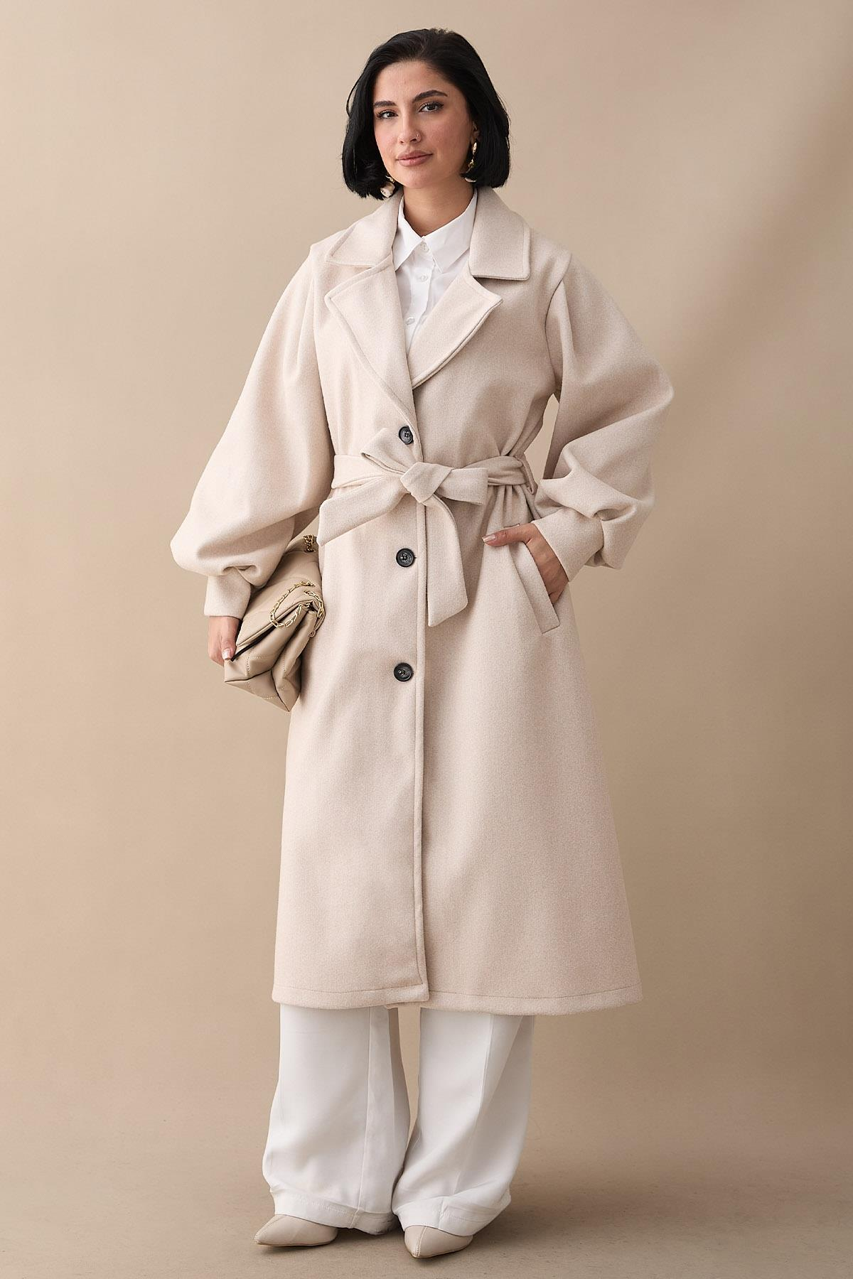 Kruvaze Balon Kol Kuşaklı Krem Kaşe Kaban (MS00PLN2001-5)