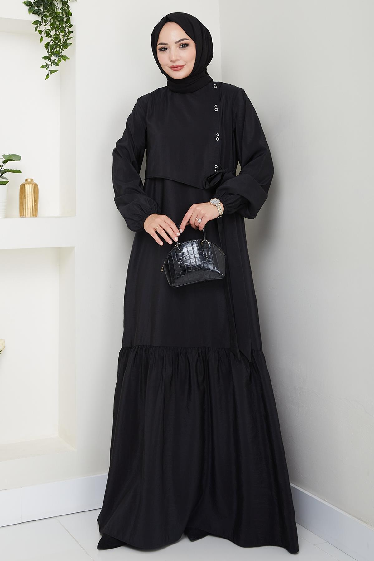 Kuş Gözü Detaylı Modal Siyah Elbise