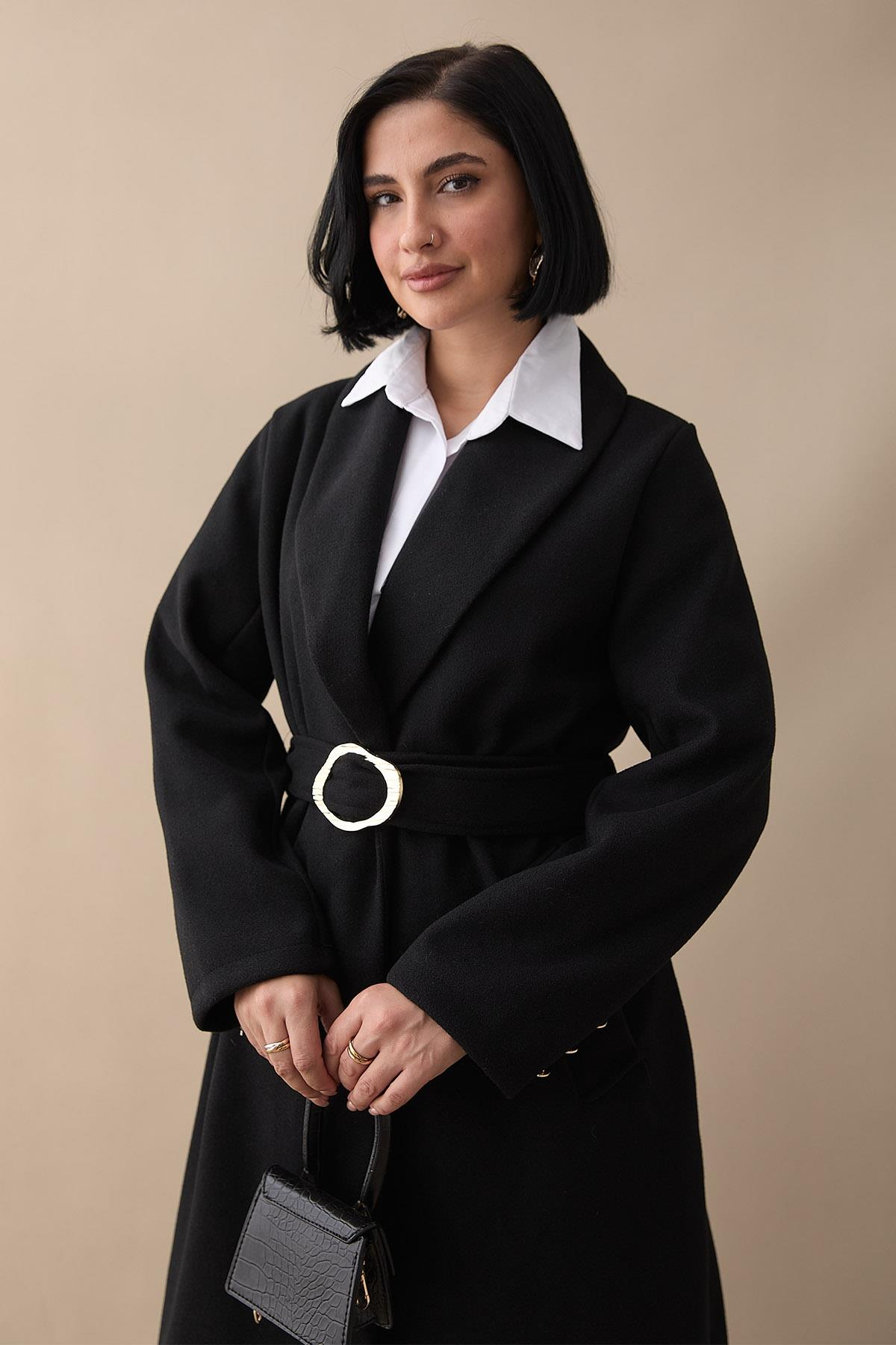 Şal Yaka Gold Kemerli Siyah Kaşe Kaban (MS00PLN2003-1)