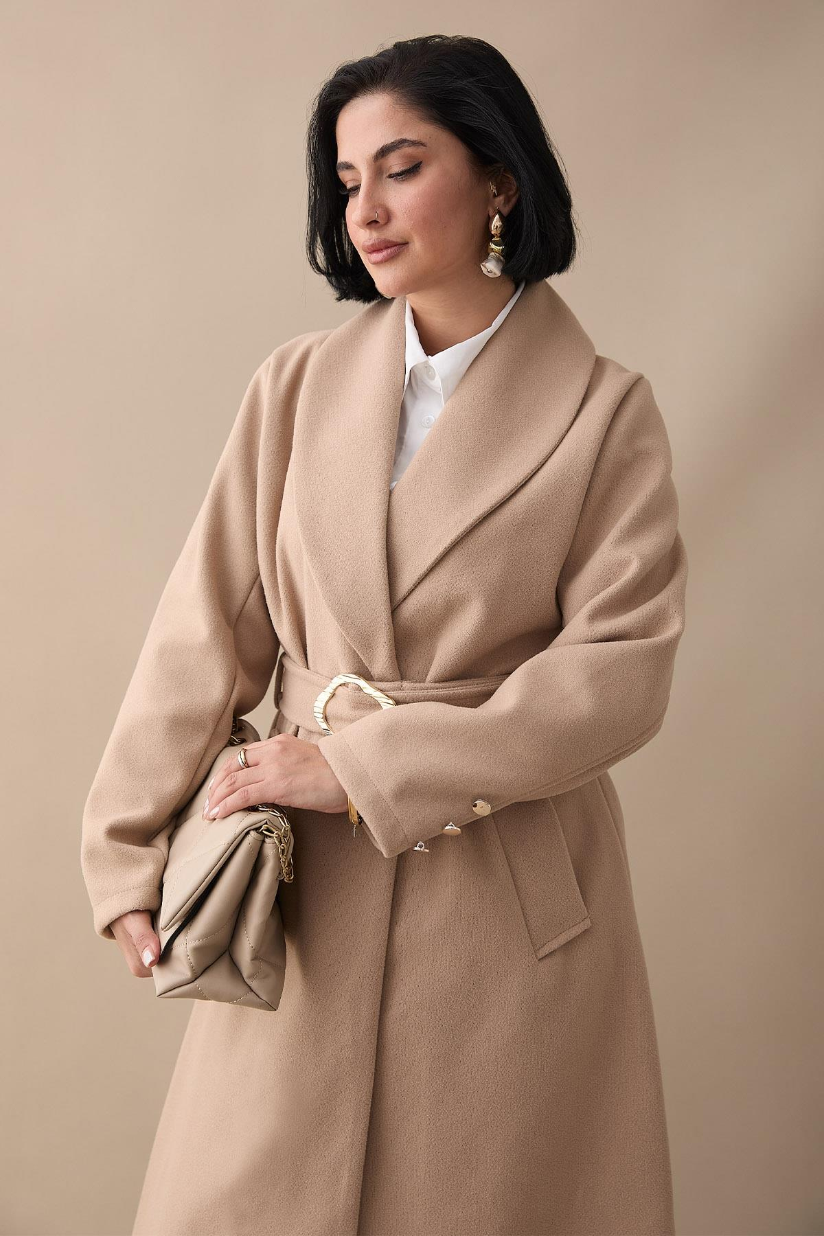 Şal Yaka Gold Kemerli Sütlü Kahve Kaşe Kaban (MS00PLN2003-4)