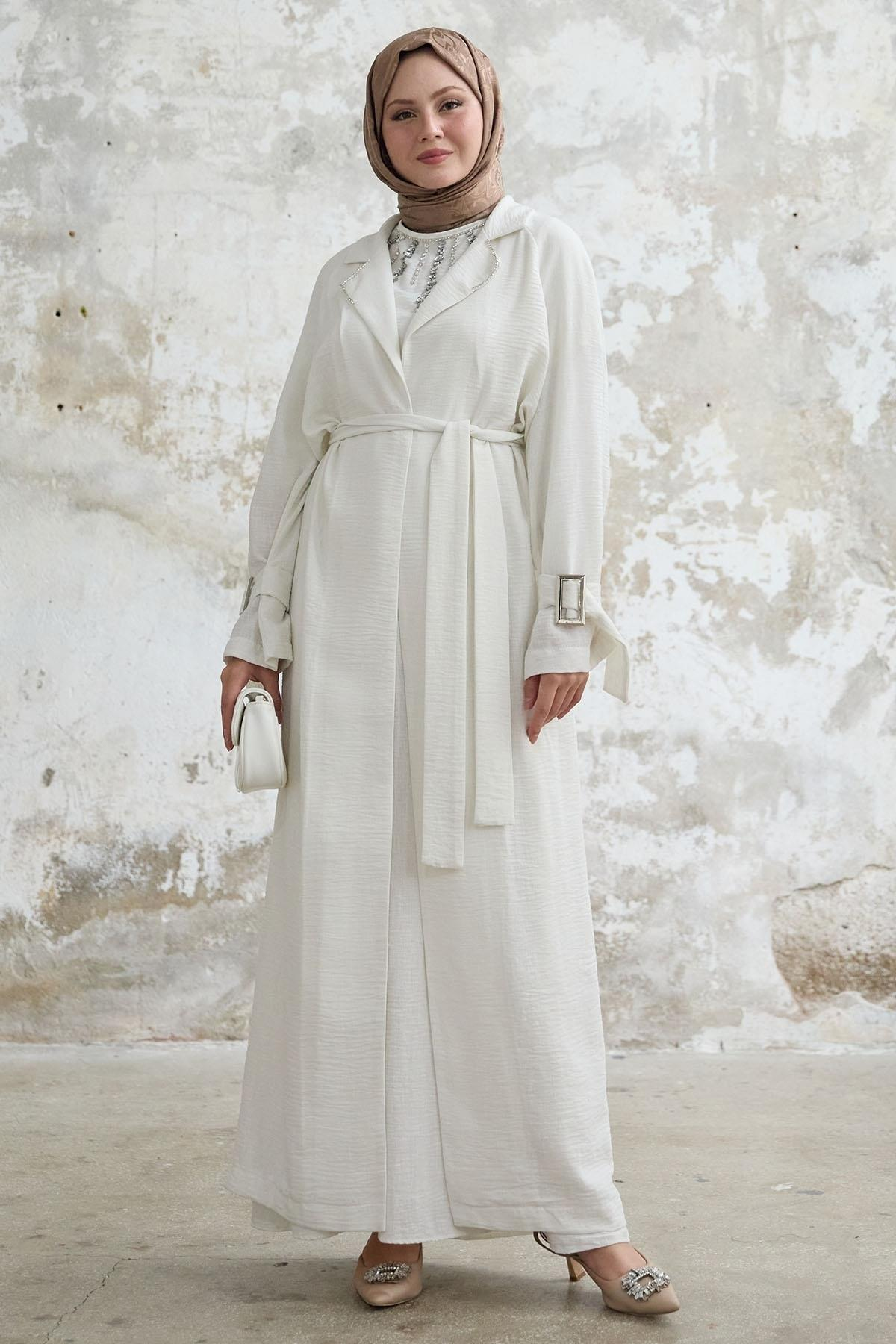 Taş Detay Keten Elbiseli Beyaz Takım (MS00LM29992-3)