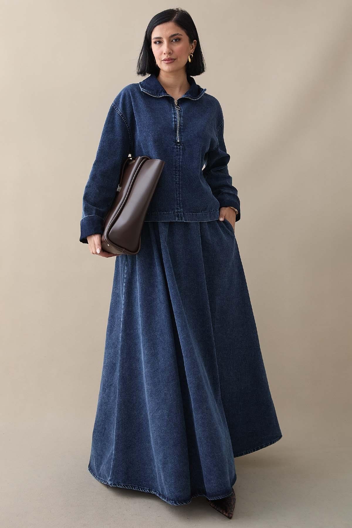 Yakası Fermuarlı Koyu Mavi Etekli Kot Takım